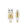 Klasický kabel s micro USB konektorem na jedné straně a velkým USB konektorem na druhé straně se liší zářivými barvami, hliníkovým krytem konektoru a kabelem potaženým tkaninou, která chrání kabel proti ohnutí a zamotání.