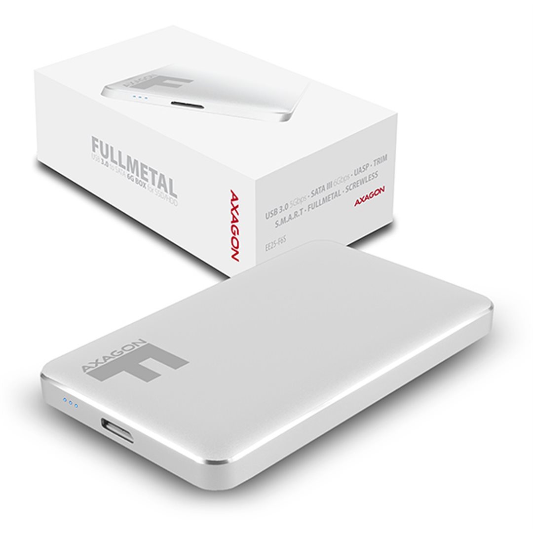 Celokovový externí box AXAGON EE25-F6S FULLMETAL SILVER s USB 3.0 a SATA 6G rozhraním určený pro 2.5" SATA pevné disky nebo SSD.