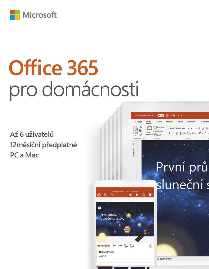 | Zakoupením tohoto software automaticky získáváte bezplatně i novou verzi Microsoft 365 Family; Vytvořte svou nejlepší práci. S Office 365 pro domácnosti získáte vy a vaše rodina Word, Excel, PowerPoint, Outlook a další. Pracujte kdekoli s aplikacemi, které jsou vždy aktualizované. ... více | |