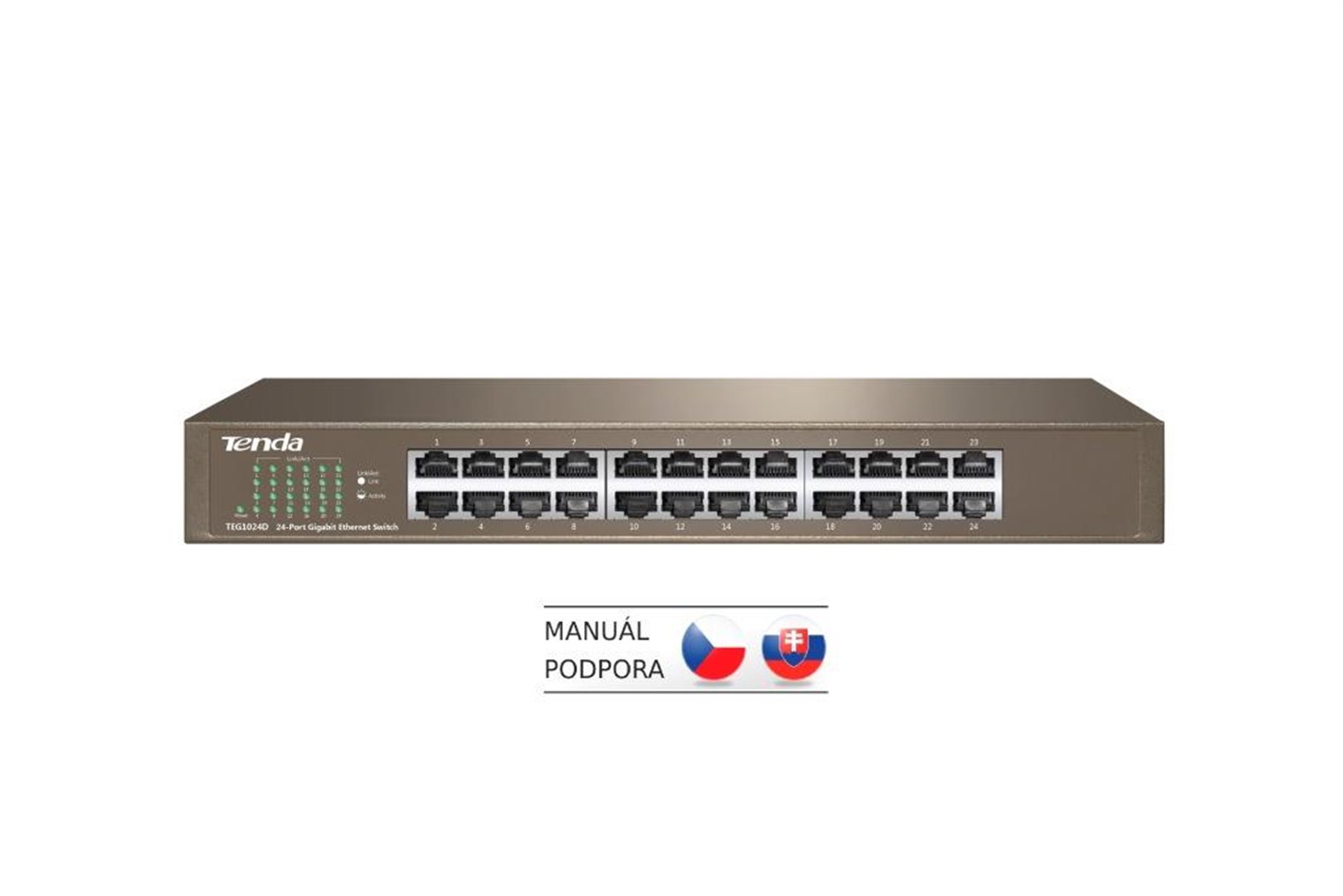 Tenda TEG1024D je 24 portový gigabitový desktop/rackmount switch. Fanless - bez ventilátorů. Auto MDI/MDIX. Ochrana proti přepětí 6000 V. Propustnost 48 Gb/s. Kovové provedení. Desktop nebo montáž do rozvaděče. Součástí balení je český, slovenský a polský manuál.