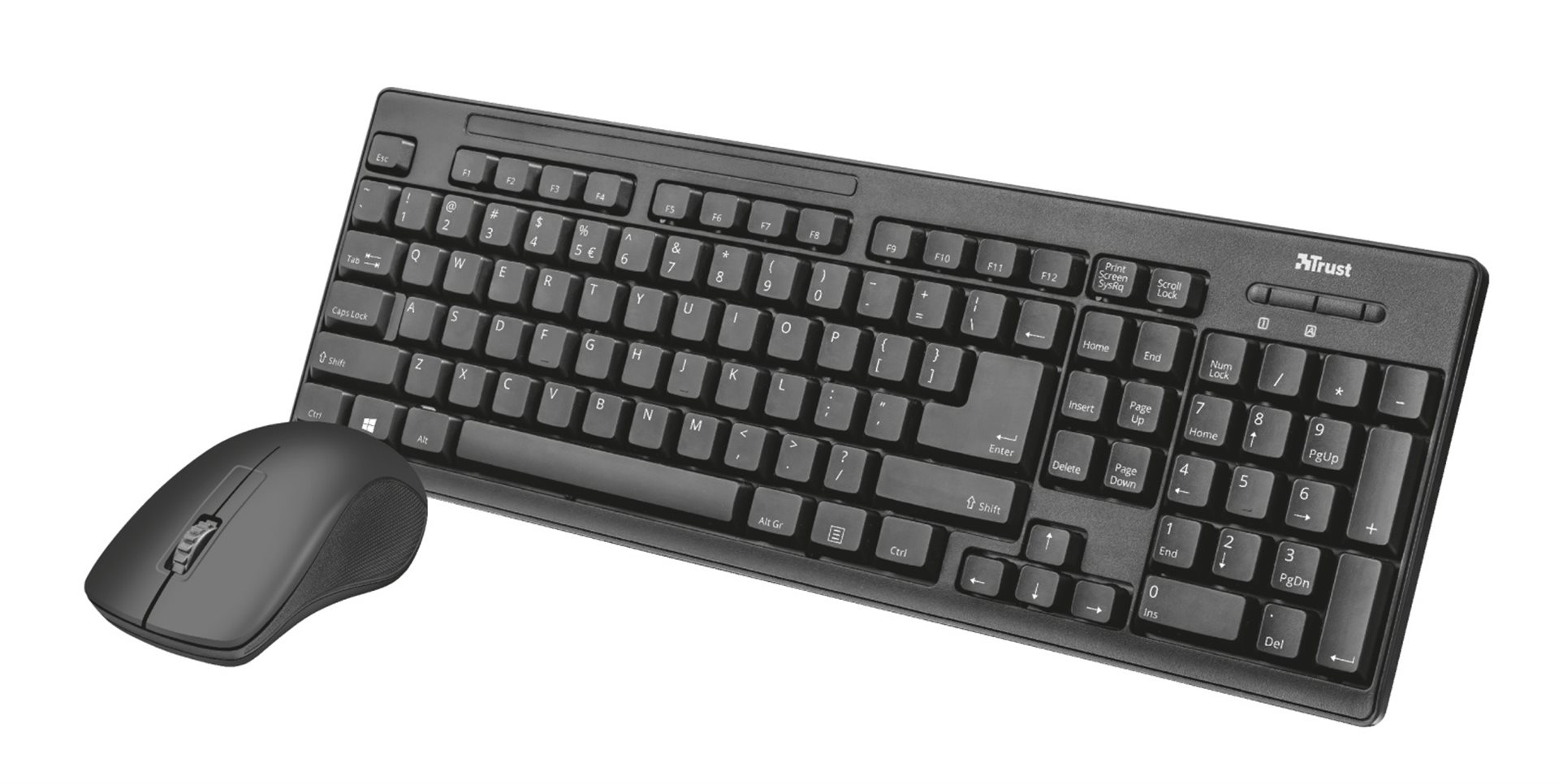 Pohodlná bezdrátová klávesnice a myš od firmy Trust určená do kanceláří. Vhodná pro praváky i leváky.